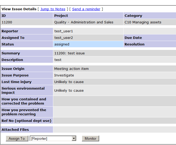 Hi David, Renaming the role would have no effect on the functionality, since all the code is based on the access level value (55 in this case). And nothing strange in your config, in fact I think it's great that Mantis is used for other purposes than software development. One key information is missing from your last report. I assume test_user1 = reporter, test_user2 = developer, but in the screenshots, it does not clearly say who you are logged on as. Your config gave me 'Notice: Use of undefined constant REFUSED' - I assume REFUSED = REJECTED. After this, I did the following