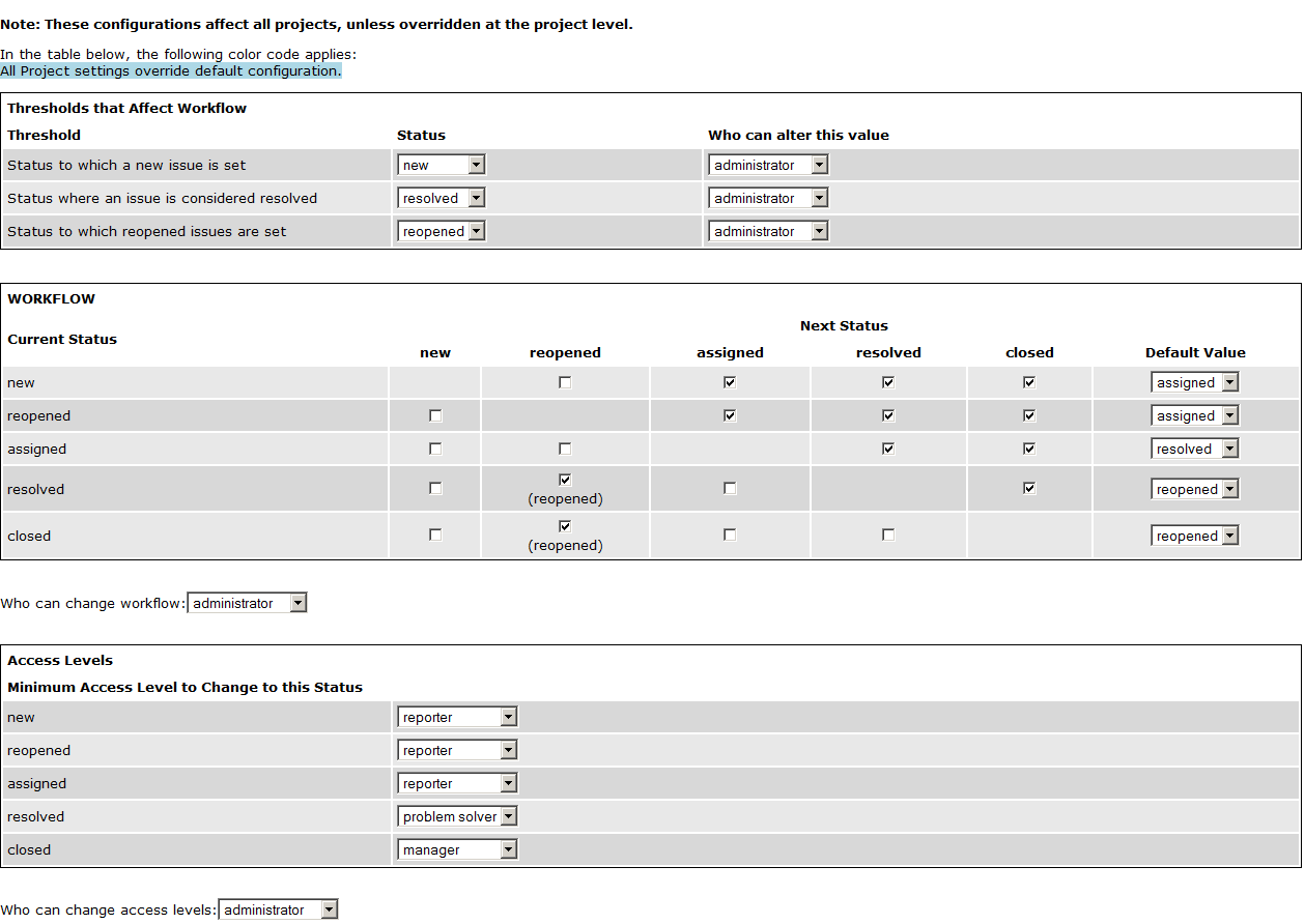 I have looked at this carefully now. It seems that users with level Manager and Administrator are not affected. The main issue seems to be that Developers have no control for resolving issues We have $g_allow_reporter_close = ON; and after resolution the Reporter has a Close button no matter whether they have a Reporter or Developer global status, so that part is OK. We changed the name of the level 55 'Developer' to 'Problem Solver'. This was done with care and has been working fine for several years. You may find ours a strange configuration, but it is designed for working with business issues not software bugs. So far it has served us well and we are big fans of Mantis. I have attached our local config files and some screen snaps. Hope you can shed some light. |
