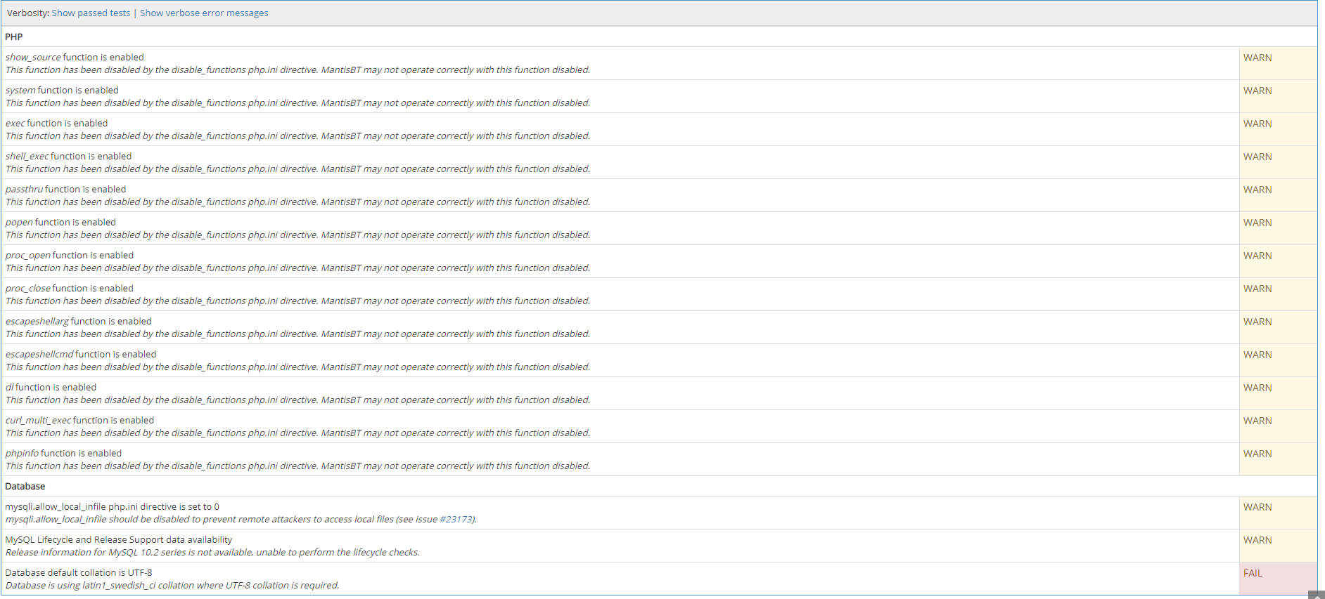 | Description | Hi, I have a problem with my new Mantis BT version (2.21). I have an old version and we migrated the content in new directory. All seems ok but the status icons appears in black every time. I tried changing the database codification, reviewing diferentent solutions in the source code and refreshing some times the page. Now, we have running PHP 5.4 but we have tried with different version between 5.4 and 7.0. I don´t have installed any additional plugins. Our config_inc.php just have information about g_show_realname and information about mail connection. Any idea to resolve this?Coul you help me? Thank you very much | ||||