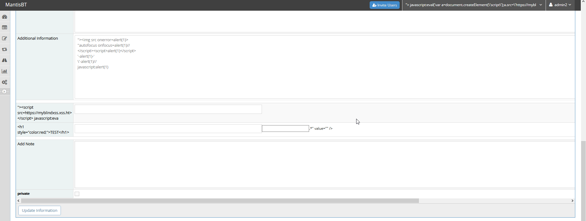 | Summary | 0027275: CVE-2020-25288: HTML Injection on bug_update_page.php | ||||