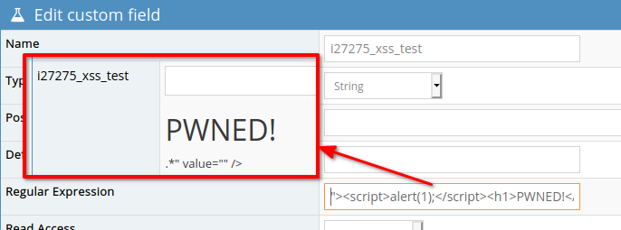 Subject: [PATCH] Fix XSS in Custom Field regex pattern validation