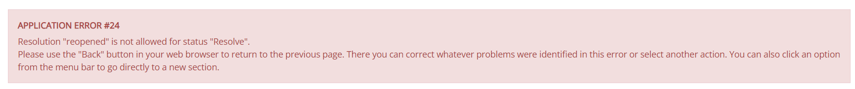 | Description | Hi! I am having an issue where i am not able to select 'reopened' resolution whenever i want to reopen my issue and it will appear this kind of error. my custom setting for status as below: a. file custom_strings_inc.php b. file config_inc.php | ||||
