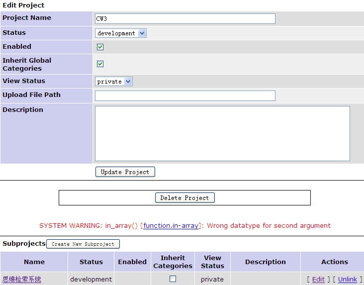 | Summary | 0011402: SYSTEM WARNING: in_array() [function.in-array]: Wrong datatype for second argument | ||||