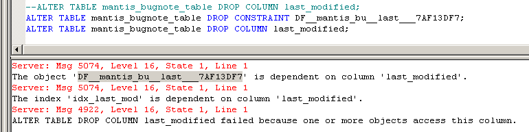 Then in the future removing default values will be easier because there won't be random names (DF__mantis_usredir7D2E8C24) given by SQL Server. It will be possible to remove default value in that way. ALTER TABLE mantis_user_pref_table DROP / Here is another error. Column can't be deleted while is a part of index. So before we delete column we have to drop index. While I was running query after query making corrections I sow about 20 first type errors and two second type. |