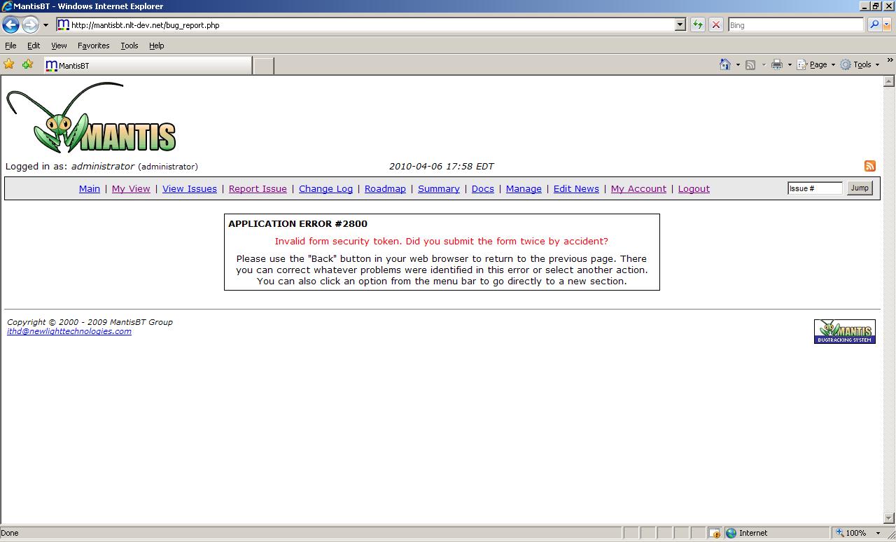 | Description | After reporting multiple issues this may occur. Usually on the second or third time when reporting an issue. Seems to happen more often than not in IE 7. Currently tested with IE7/8, Firefox. After reporting an issue the user is present with an error: Invalid form security token. Did you submit the form twice by accident? Once this error occurs, it will keep happening. | ||||