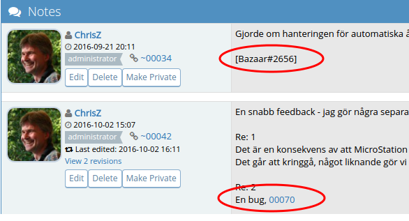 Ideally, the bug/note replacement should not be performed within preformatted parts of text. For example: "pre" tags, or equivalent notation. But that is not feasible with current system, a proper parser is required to do that correctly. |