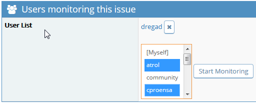| Description | It would be nice when adding users to the monitoring list of an issue, to be able to select them from a list instead of having to type the username blindly, particularly when Mantis is configured to display Realnames. | ||||