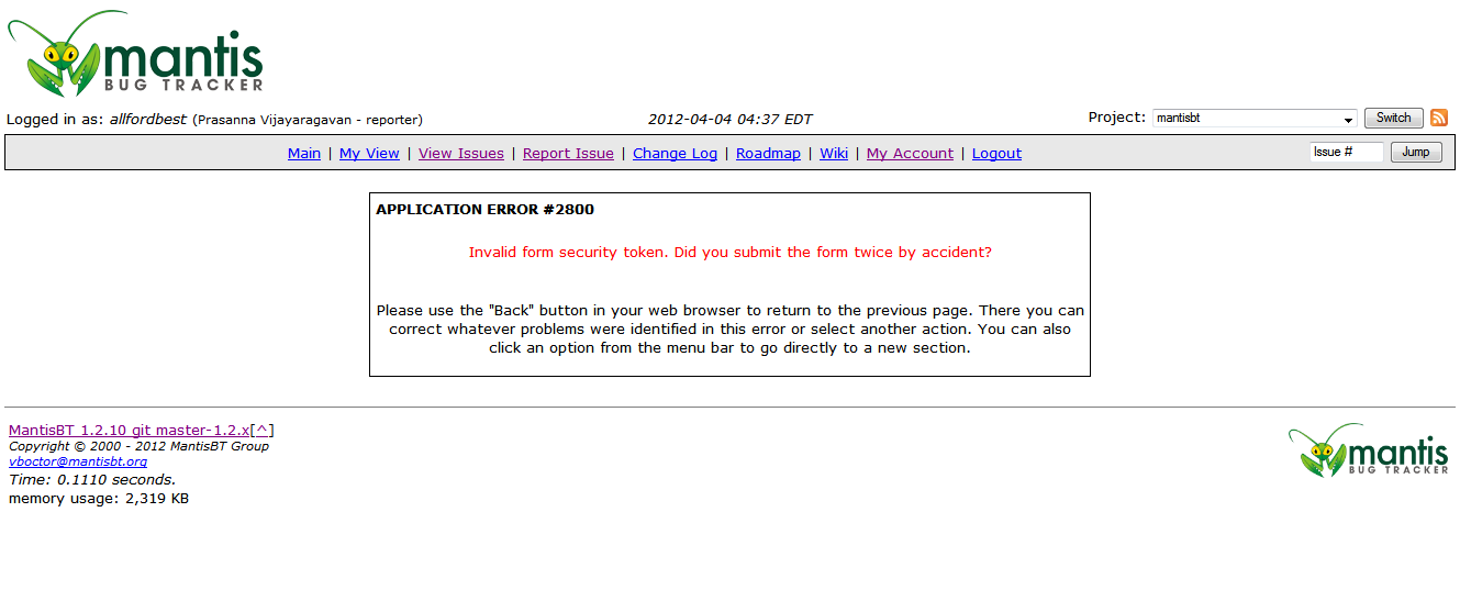 | Description | Instead of time out message,the following message is being displayed in mantis: "Invalid form security token. Did you submit the form twice by accident?" | ||||