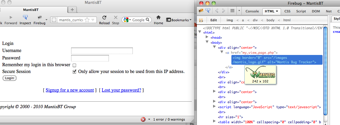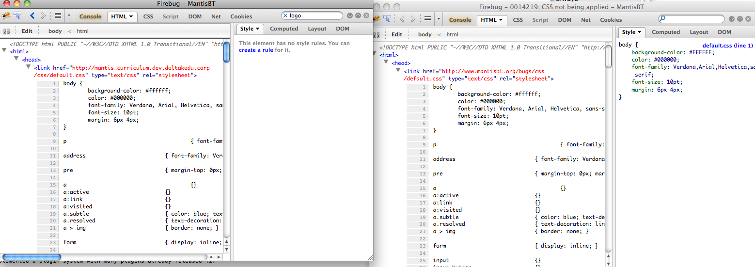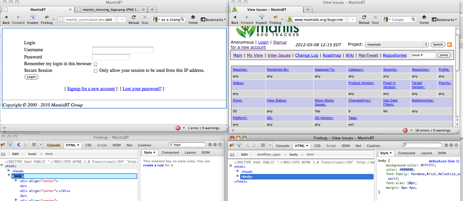 | Description | The mantis logo and all other artwork are missing. Upon inspection, none of the CSS selectors appear to match their corresponding HTML elements. The mantis logo is clearly visible by mousing over the SRC in Firebug. The default.css is in the HEAD, and can be loaded and viewed. | ||||