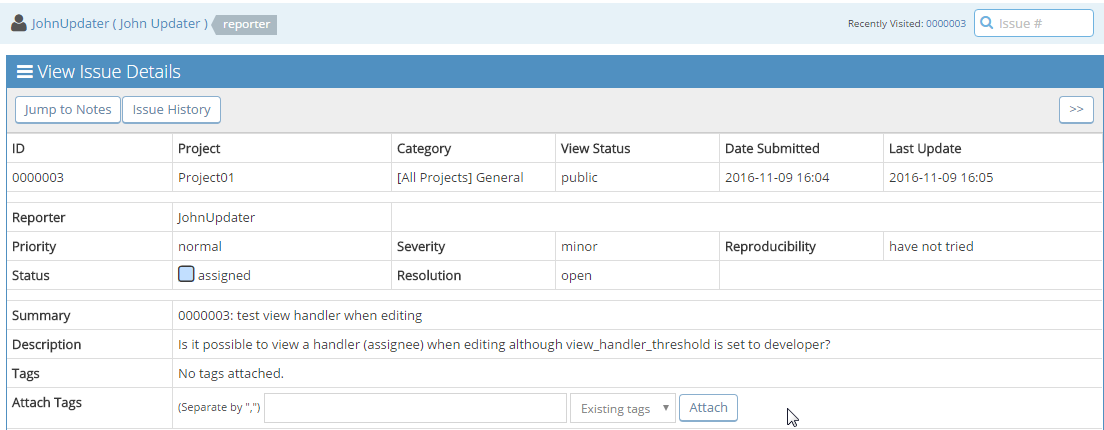 | Description | if the view_handler_threshold configuration value is set to hide the handlers to reporters, the handlers are visible when the reporters edit an issue. | ||||