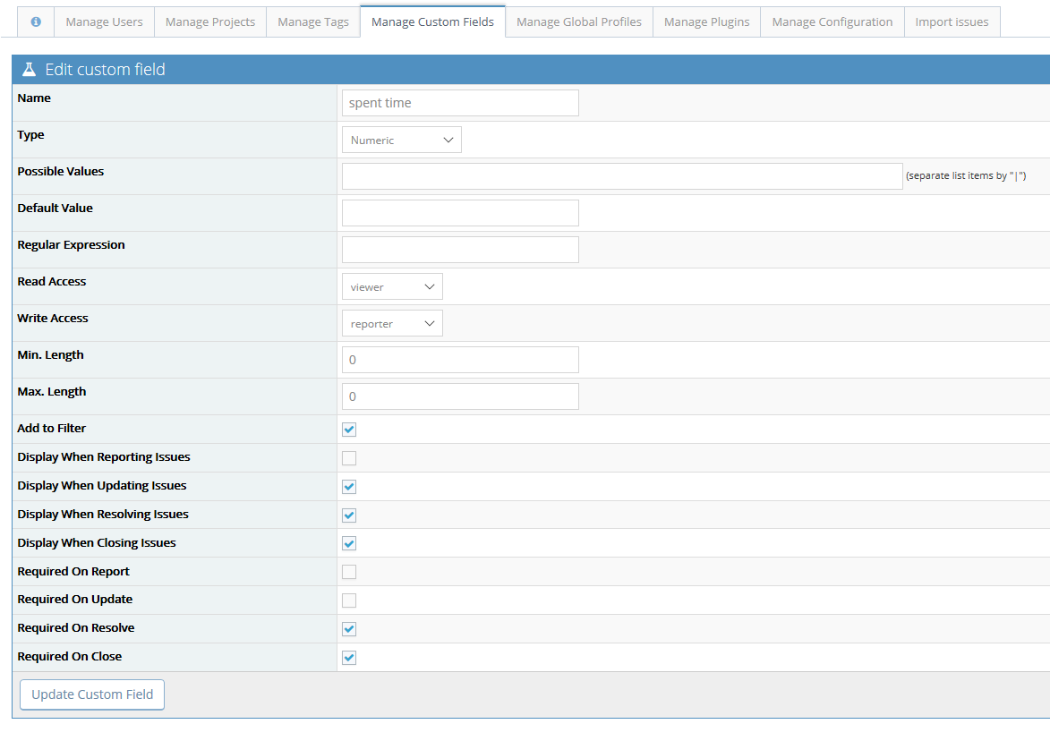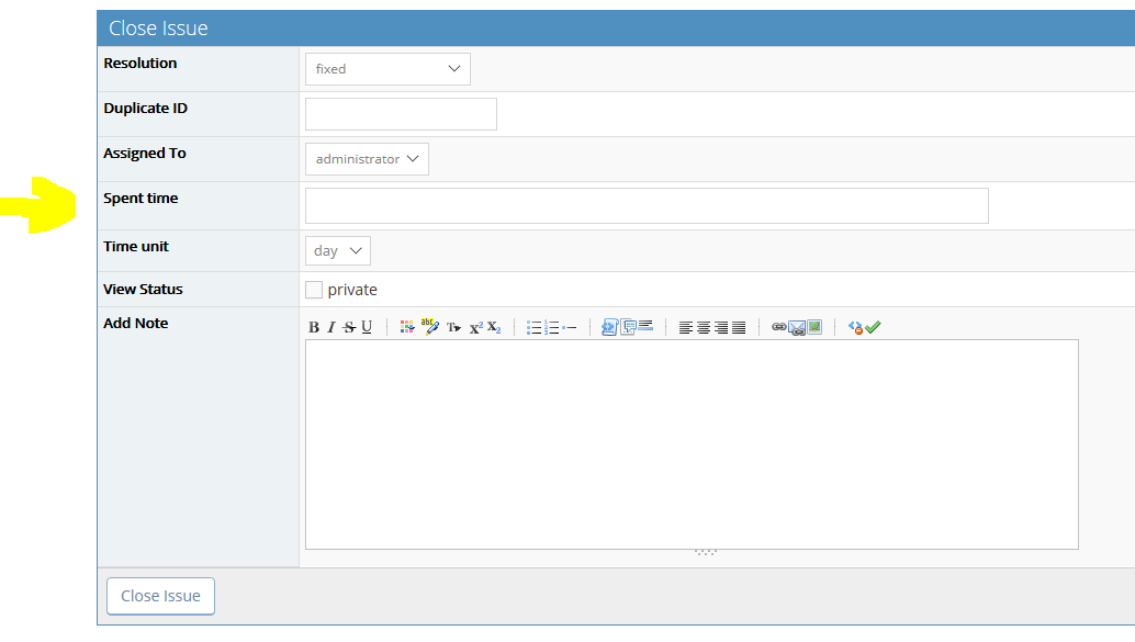 | Description | Hi, I have migrated to Mantis v.2.0 successfully. How can I set for the required fields to showing "marked as required"? For example, if I close a ticket from resolved, before "spent time" text does not shows marked as required field. See missing features in attachements. Thank you in advance. Best regards, | ||||