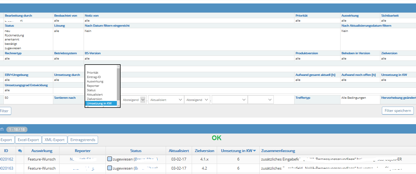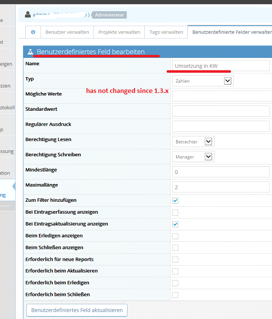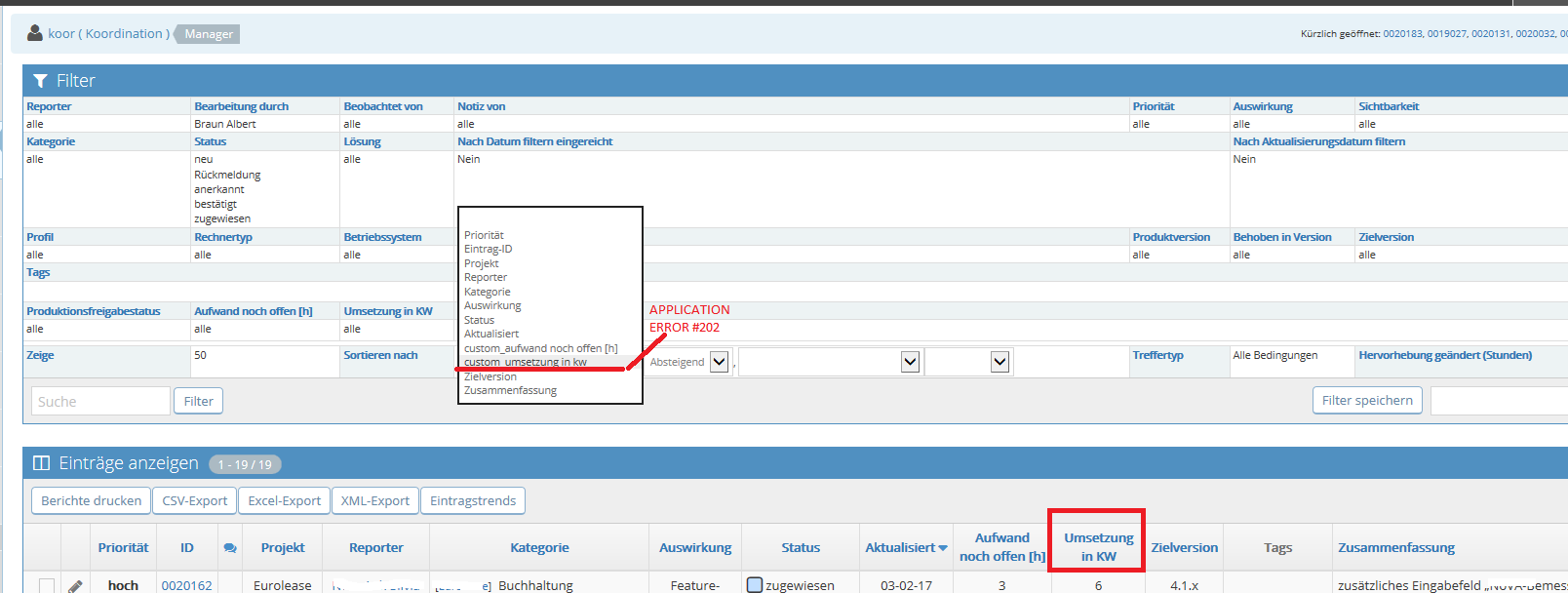 Slowly we get behind it - with Permalinks and the filter errors - this is a mantisbt - 1.3.6 – custom fields are all lower case – this permalink does not work with 2.x.x: mantisbt – 2.1.x – custom fields are upper case like they are defined in the admin dialog: http:// www.YOURDOMAIN.at/mantis/search.php?status[]=10&status[]=20&status[]=30&status[]=40&status[]=50&handler_id=373&sticky=on&sort=custom_Umsetzung%20in%20KW%2Cpriority&dir=ASC%2CDESC&hide_status=-2&match_type=0 1.3.x sort=custom_umsetzung => 2.x.x custom_Umsetzung You could reproduce the error if you define a column in your account settings, were you store everything in lower case. AND If hou have defined a custom-field before in 1.3.x in lower case in “View Issues Columns” and you migrate to mantis 2.x.x, so you will get the error in “view_all_bug_page.php” – that is the cause!!!! |
