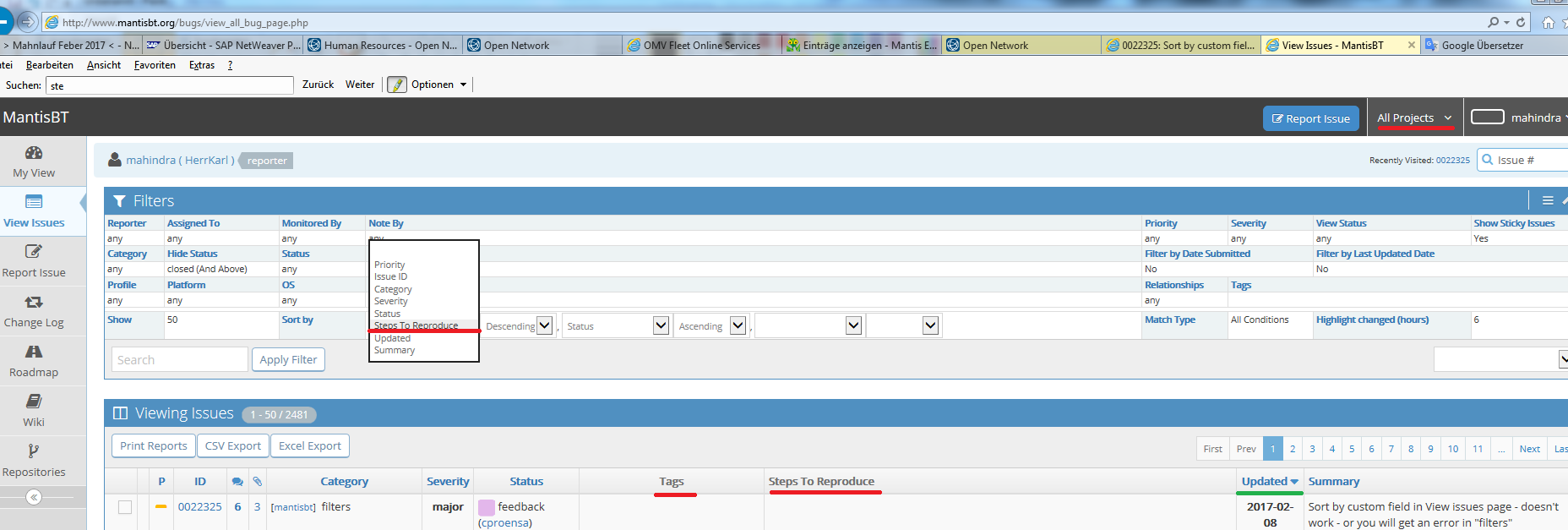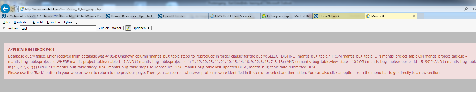 I've figured it out => Database query failed. Error received from database was #1054: Unknown column 'mantis_bug_table.steps_to_reproduce' in 'order clause' for the query: SELECT DISTINCT mantis_bug_table.* FROM mantis_bug_table JOIN mantis_project_table ON mantis_project_table.id = mantis_bug_table.project_id WHERE mantis_project_table.enabled = ? AND ( ( mantis_bug_table.project_id in (1, 12, 20, 25, 11, 21, 10, 15, 14, 16, 9, 22, 6, 13, 7, 8, 18) ) AND ( ( mantis_bug_table.view_state = 10 ) OR ( mantis_bug_table.reporter_id = 5199) )) AND ( ( mantis_bug_table.status in (?, ?, ?, ?, ?, ?) ) ) ORDER BY mantis_bug_table.sticky DESC, mantis_bug_table.steps_to_reproduce DESC, mantis_bug_table.last_updated DESC, mantis_bug_table.date_submitted DESC. Please use the "Back" button in your web browser to return to the previous page. There you can correct whatever problems were identified in this error or select another action. You can also click an option from the menu bar to go directly to a new section. |