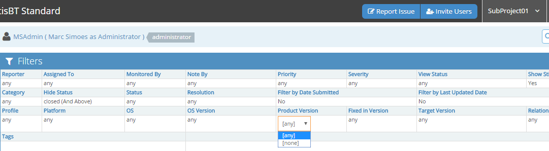| Description | if the parent project is selected, the product versions appear; if a sub-project is selected, then they do not appear, although the product versions of the parent project are available when reporting an issue | ||||