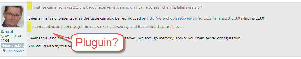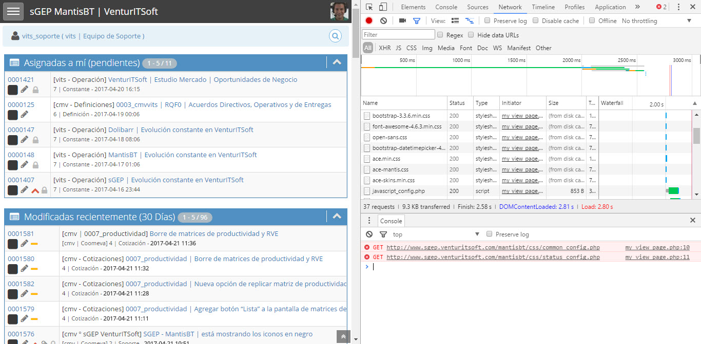 Hello Astrol, thanks for the reply, could you please help us? We are attaching the warnings and errors we have created from scratch the vrs 2.3.0 and you can enter: www.hqo.sgep.venturitsoft.com/mantisbt-2.3.0/ "login.jpg" logs for errors : [Sun Apr 23 15:48:39.829088 2017] [:error] [pid 574353:tid 140483523233536] (12)Cannot allocate memory: [client 181.53.217.203:52417] couldn't create child process: /opt/suphp/sbin/suphp for /home/venturit/public_html/_proyecto/hqo-sgep/mantisbt-2.3.0/css/status_config.php, referer: http://www.hqo.sgep.venturitsoft.com/mantisbt-2.3.0/my_view_page.php Could you give us some new guidance? Why do you think refreshing the page sometimes looks good color and sometimes does not load css / status_config.php styles? And other times yes load? Thanks common_config.php (2,426 bytes)
