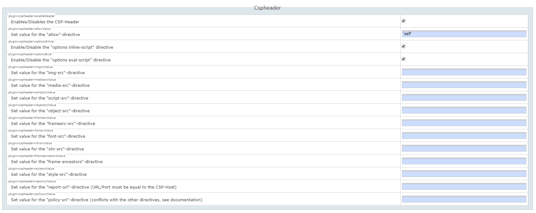 Hi @dregad, I use Release 2017-02-19e "Frusterick Manners" And have indeed a lot of plugins. However I also found out there is a CSPHeader plugin. |
