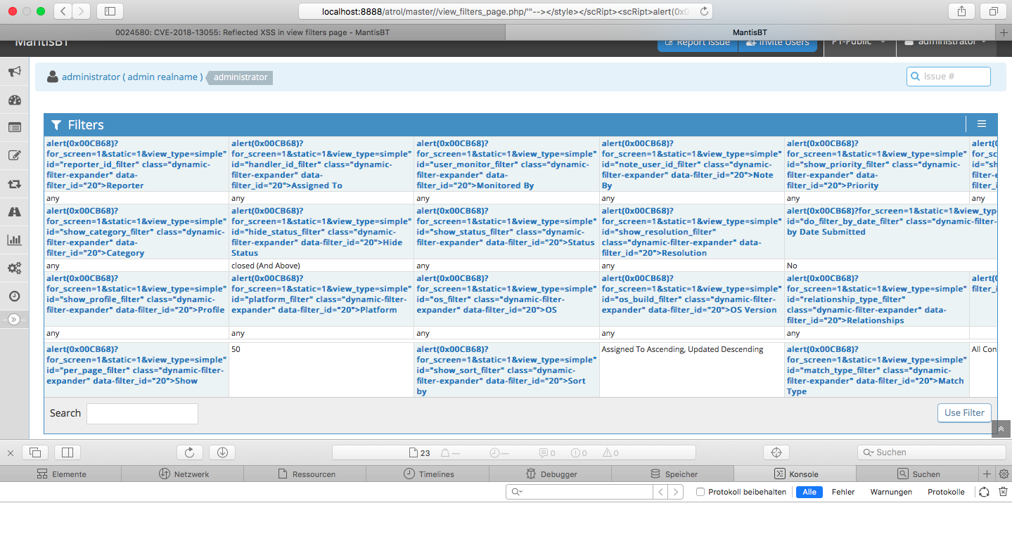 | Summary | 0024580: CVE-2018-13055: Reflected XSS in view filters page | ||||