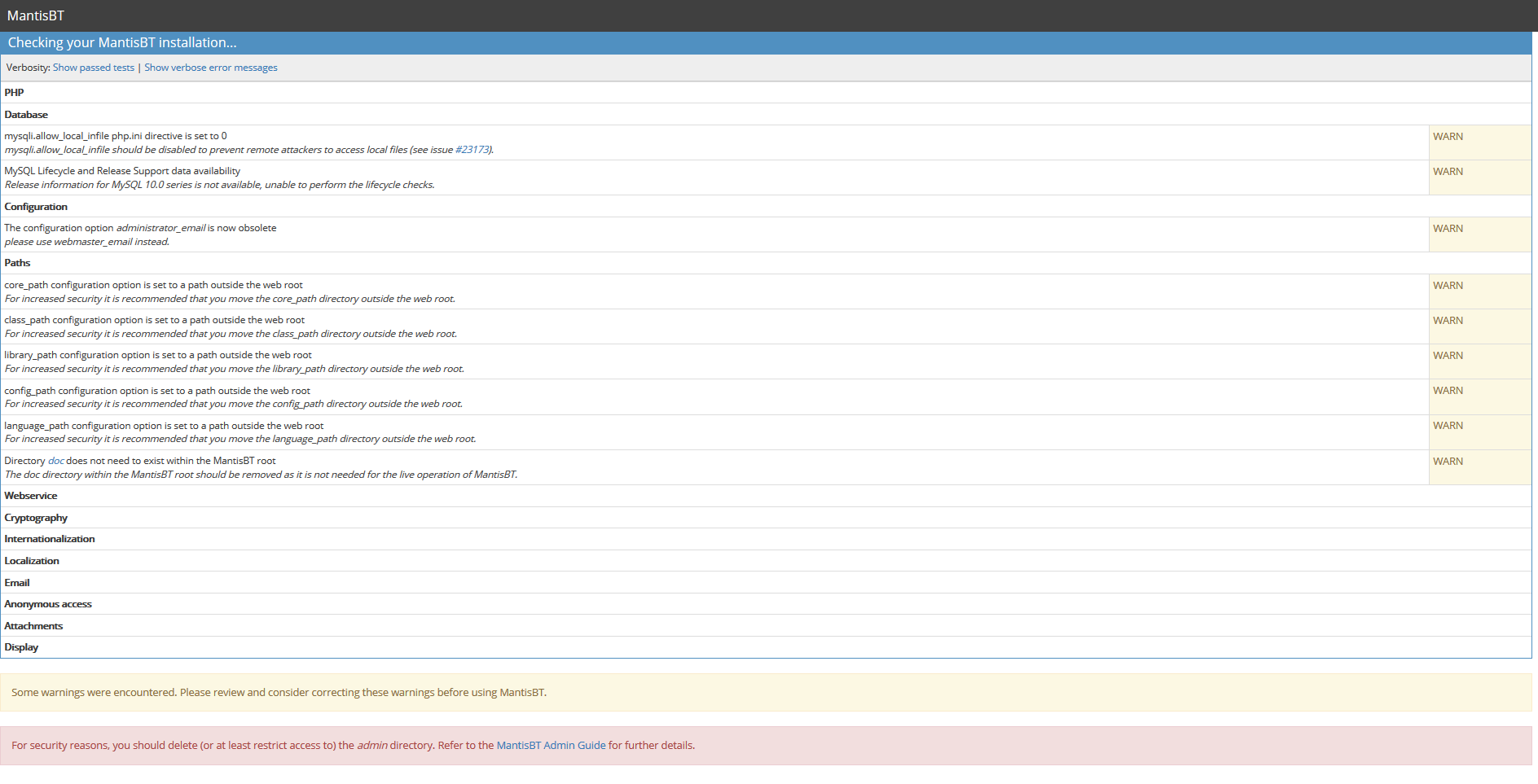 the only warnings i get from the mantis check are security and email related: mysqli.allow_local_infile php.ini directive is set to 0 core_path configuration option is set to a path outside the web root webmaster_email configuration option has a valid email address specified but nothing critical for uploaded files, the php log files are also not showing any errors or warnings for mantis BT |