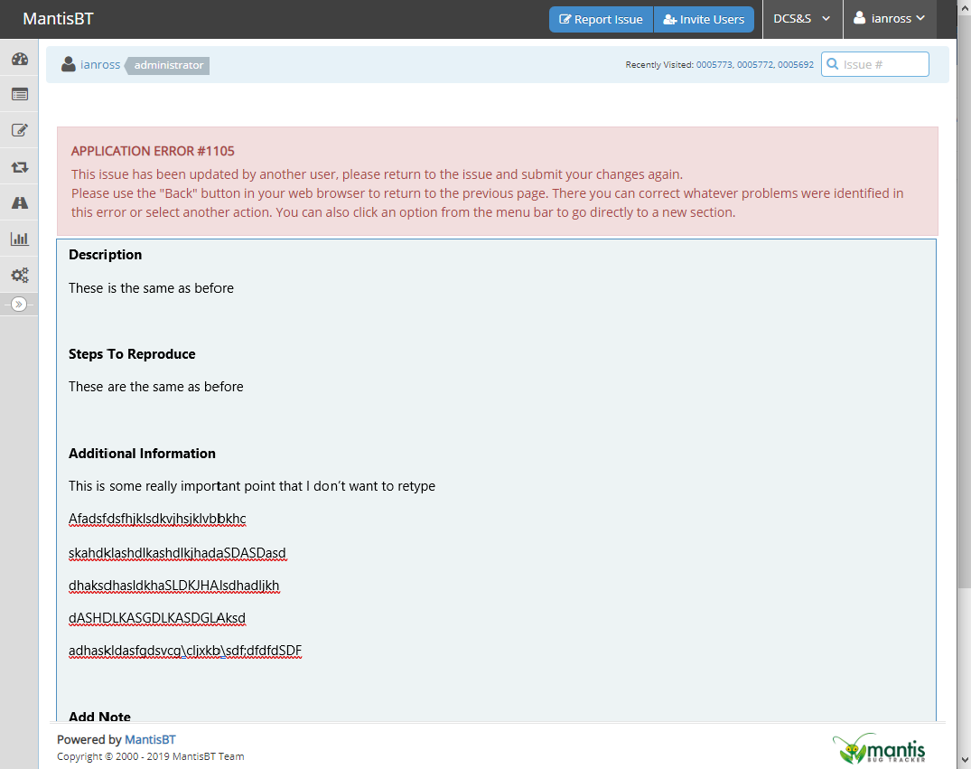 | Description | This is a known issue and appears to be accepted as part of the fix for https://www.mantisbt.org/bugs/view.php?id=5466 Would it be possible to display the text entered as part of the error message? This would only be required for (non-custom) fields that could contain significant updates: This could be concatenated into one block and then the user can cut it hit back and paste it as required. | ||||