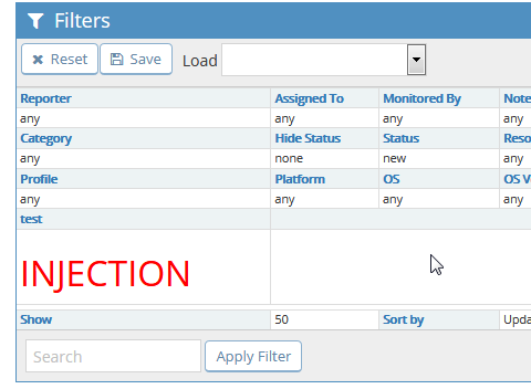 | Description | The content of the filter variable in the view of the view_all_bug_page.php is not filtered, allowing a thirdparty to inject HTML. This would usually be a Cross Site Scripting Vulnerability, but the Content Security Policy header blocks executing scripts. However it might still be possible to achieve XSS by invoking functionality from the bundled javascript libraries. The output should be properly html-escaped. | ||||