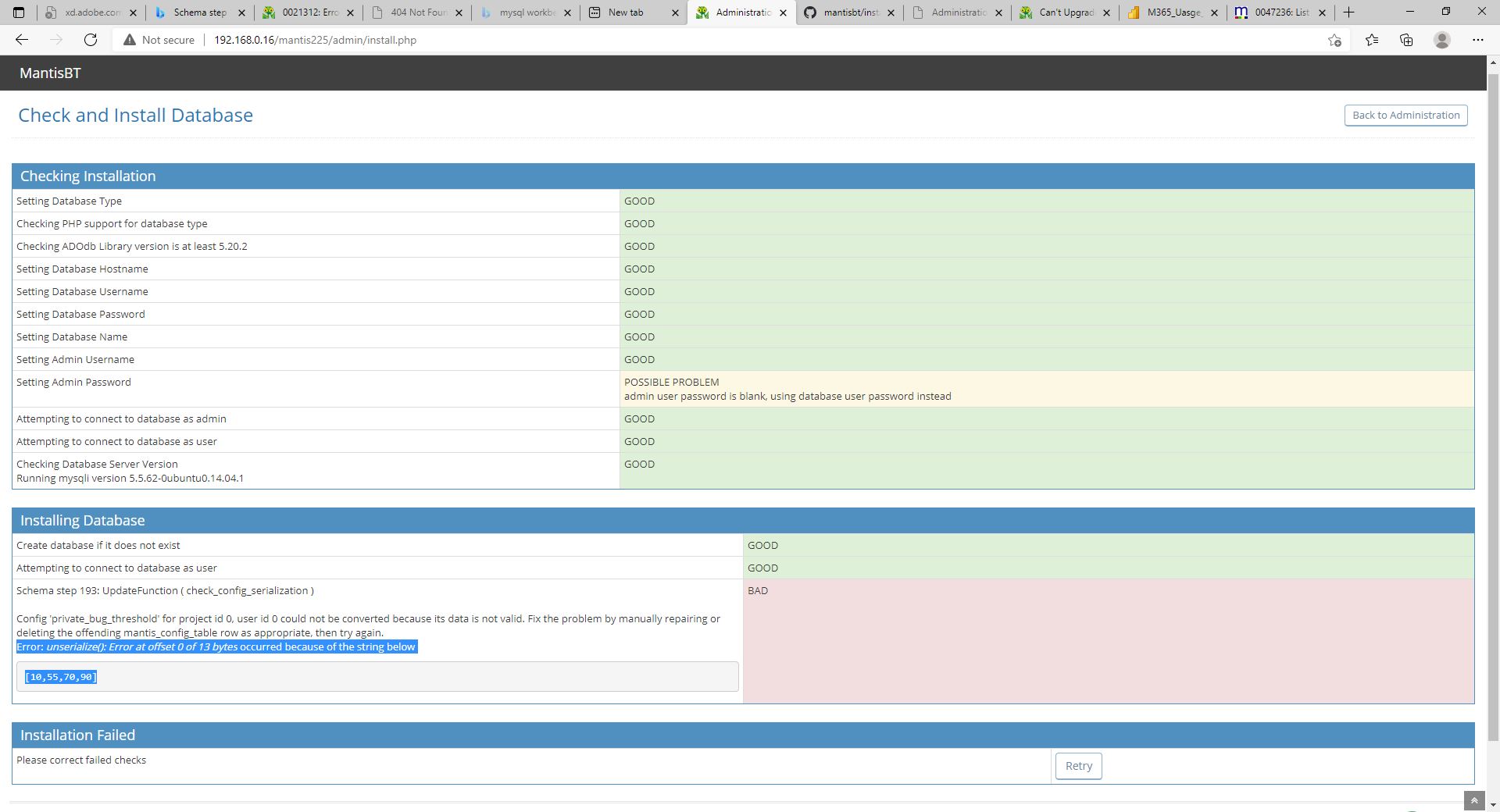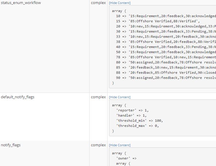 This removes all "complex" types from your config, which is like using a nuke to kill a mosquito... probably explains the workflow transition errors you're experiencing too. Don't do that. The upgrade process is normally quite specific about the config which is causing a problem during upgrade; looking at the provided screenshot, the issue is with the private_bug_threshold record for all projects/all users, which apparently contains a json-encoded array of values, while the installer expects serialized data ( |