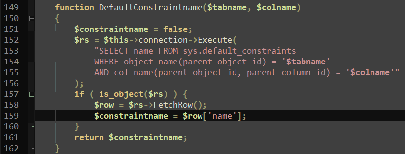 | Description | I got the blocking error: "Attempting to access array offset on value of type bool" originating from function DefaultConstraintname in datadict-mssqlnative.inc.php file (line 159), which prevents me from installing the application. | ||||