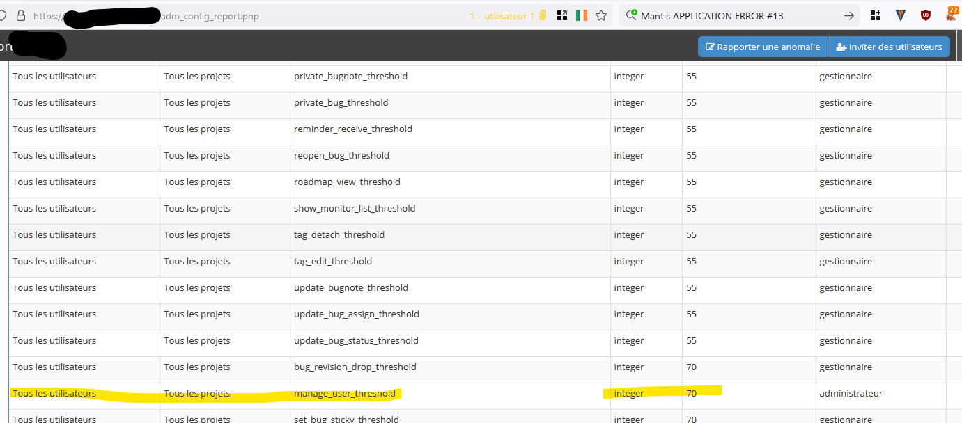 There are no other entries of manager_user_threshold. Actually, this problem occured on a fresh install of MantisBT 2.25.2 with 2 projects and 4 users and almost no customization by project. The fix is not a priority as the file configuration seems to be a valid workaround. |