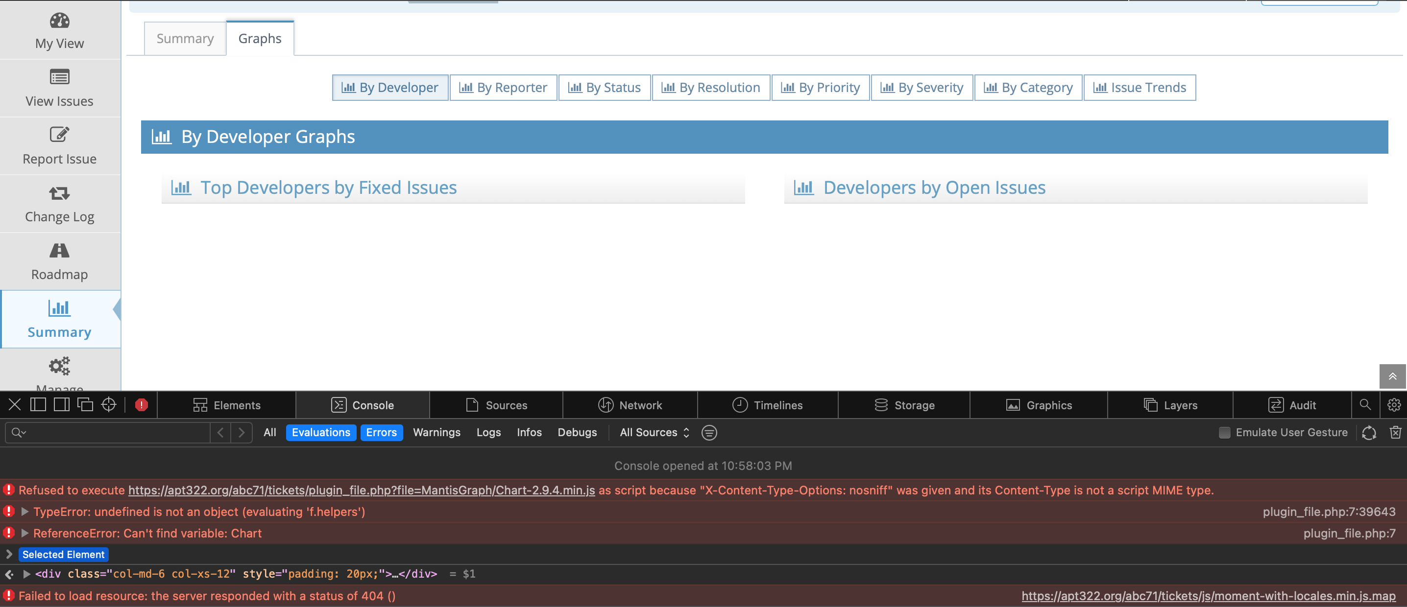 | Description | Hi folks, I don't know if it is necessary a mantisbt bug/incompatibility, or an Apple Safari issue. In Summary --> Graphs, the graphics don't show in Apple Safari. In my apache, I dont have X-Content-Type-Options activated. In Google Chrome and Firefox, the graphics show me perfectly fine. If I inspect the page, none warning or error. Only in Apple Safari the graphics don't and I see this error if I inspect the page. | ||||