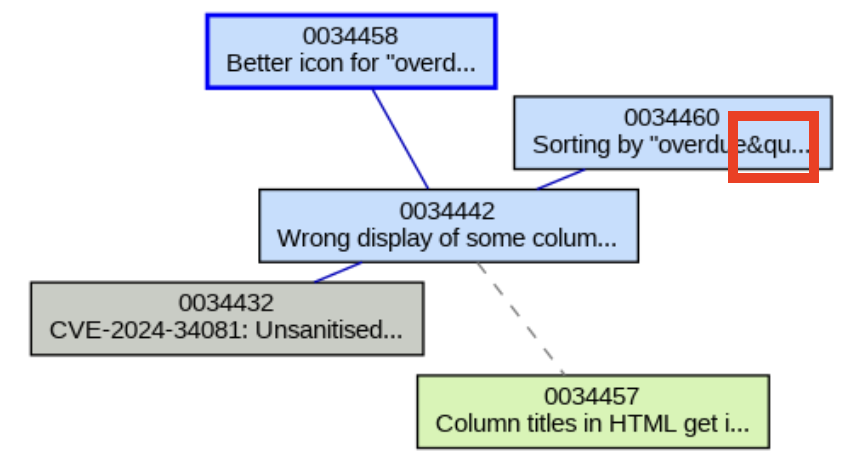 | Description | When displaying Relationship and Dependency Graphs with Summary, if an Issue's summary contains HTML special characters the truncation logic to keep the nodes boxes small does not detect them and could truncate the output in the middle of the encoded entity, as shown in attached screenshot. Truncation should occur on raw Summary text, and escaping should only happen after that. | ||||