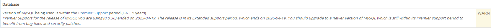 | Summary | 0034480: Using MySQL 8.4 gives warning in admin checks | ||||