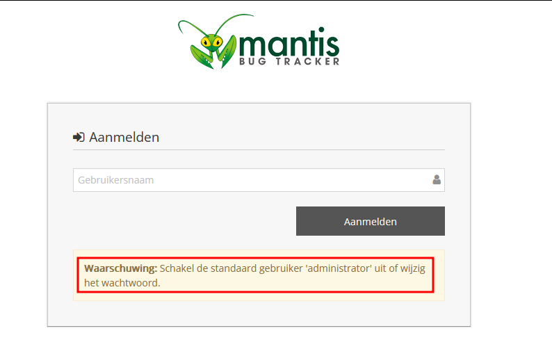 Hello, Thanks for the report. This behavior is by design. The purpose of this message is to remind the Administrator that they have not changed the administrator account's default password, which is indeed a security risk. The appropriate solution is not to remove the warning, but for the person who installs MantisBT to use a different password (or even better, not to use the default If for some reason you really want to keep the default account and password (which would be a silly thing to do from a security standpoint), you can disable the warnings on the login page by setting For the record, we have a long-standing feature request, to request the admin account and password at install time, that should fix this; see 0010968. |