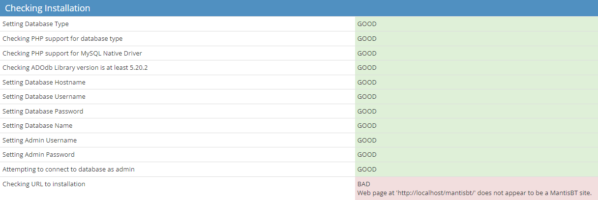 | Summary | 0034587: Checking URL to installation - Web page at 'http://localhost/mantisbt/' does not appear to be a MantisBT site. | ||||