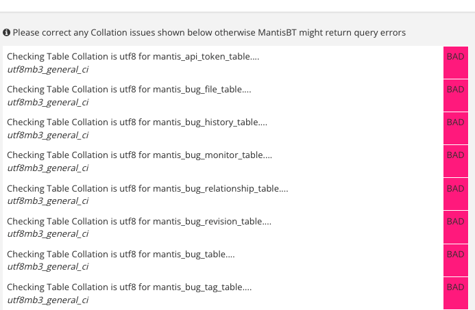 | Summary | 0034650: "Checking Table Collation is utf8" errors (utf8mb4, utf8mb3) | ||||