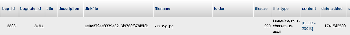 Hello, I tried to reproduce this using the provided instructions, but while I'm able to upload the fake JPG SVG file, and while I can see in the bug_file table that it has a mime type of Am I missing something ? |